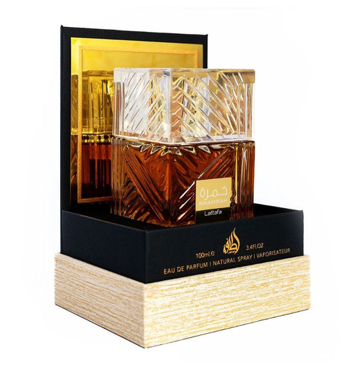 Khamrah Eau de Parfum Lattafa Perfumes классифицируется как унисекс-аромат и принадлежит семействам Древесные, Цветочные, Восточные, Гурманские и Бальзамические.