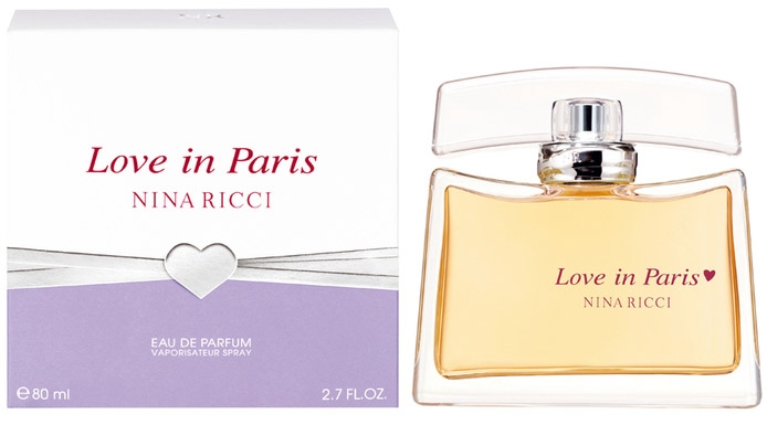 Аромат Love in Paris — элегантный, свежий аромат, который относится к группе цветочных. Аромат был выпущен в 2004 году Ниной Риччи. Такой аромат подходит далеко не всем женщинам, его надо уметь носить, так как он довольно терпкий. Такой аромат лучше использовать в праздничные мероприятия. Верхними нотами аромата являются: персик, пион, звездчатый анис, груша, банан, бергамот и роза. Нотами сердца стали: фиалка, абрикос, анис и жасмин. Базовыми нотами являются: древесные ноты и мускус. Этот аромат выражает теплоту, таинственность и соблазнительность. Аромат Love in Paris — аромат, который дарит романтику Парижа и наполняет вашу жизнь атмосферой поэзии и любви.